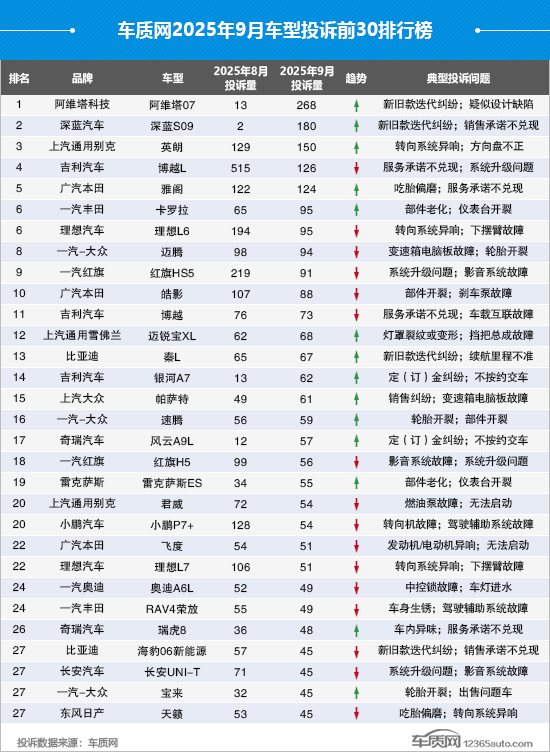 数据显示,本月车质网受理的有效投诉信息共涉及954款车型,其中投诉达两位数(含)以上的车型233款。此外,车质网本月共接到车企针对投诉的回复18,623条(含部分之前月份投诉的回复)。在去除投诉人因为车企解决得当而自愿申请撤诉的信息后,2025年9月投诉量前30的车系(车型)排名如下:
