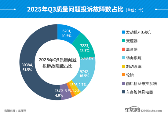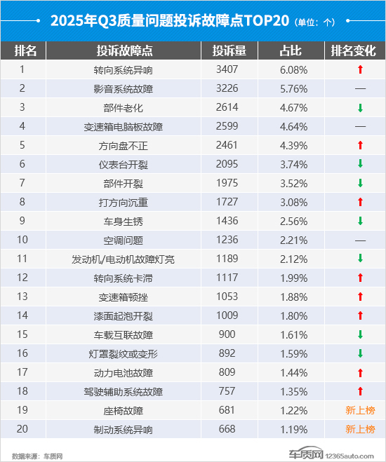 从质量问题投诉故障数占比情况来看,三季度转向系统占比升至两位数,较上季度提高了6.8个百分点,投诉故障数涨幅领先于其他系统,环比上涨140.7%。其中,“转向系统异响”和“方向盘不正”依然是投诉焦点,两者的投诉故障数均出现翻倍增长。此外,车身附件及电器的投诉故障数环比也有明显增长,较二季度上涨31.3%,“影音系统故障”成为投诉主要增长点。