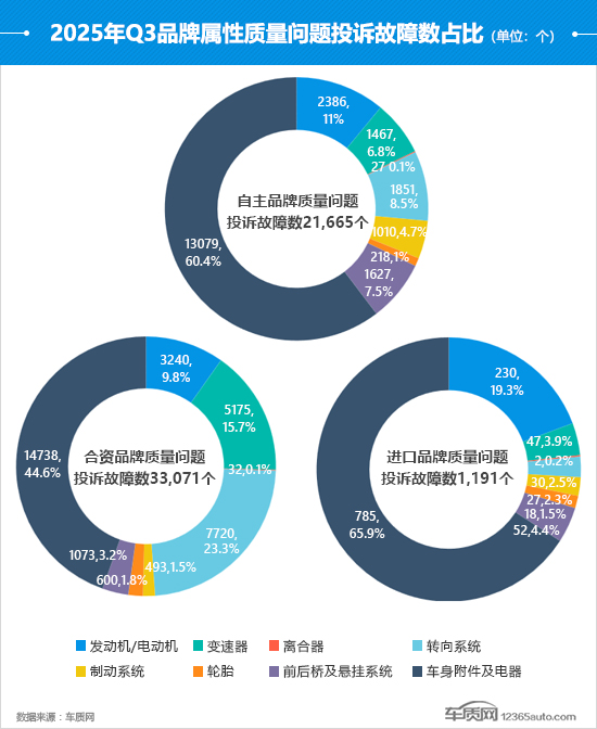 三季度,自主、合资和进口品牌的质量问题投诉故障数均呈现增长态势,尤其是合资品牌,环比涨幅领先,较二季度上涨42.1%。从投诉故障数占比变化来看,自主品牌和合资品牌的增长点都来自于转向系统,后者占比提高了9.1个百分点,已超过总量的1/5。反观进口品牌,发动机/电动机占比有所提升,投诉故障数环比上涨47.4%,投诉集中在部分林肯品牌进口车型。