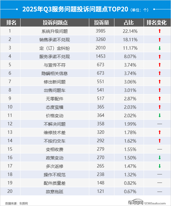 从TOP20投诉问题点榜单来看,大多数问题点的排名都有所提高,“系统升级问题”和“销售承诺不兑现”成为焦点,两者的投诉问题数均超过了3000个,且都出现了环比翻倍增长。另外,“无零配件”排名升至榜单前10名,投诉问题数环比上涨87.3%。