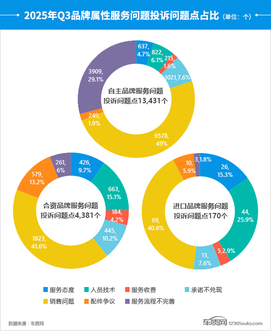 三季度,自主品牌的投诉问题点涨幅领先于合资和进口品牌,环比上涨29.1%,服务流程不完善占比大幅提升,较二季度增加了11.4个百分点,超过了总量的1/4,“系统升级问题”是主要投诉增长点。合资品牌面临的服务问题投诉问题点中,除了销售问题外,配件争议占比变化明显,已升至两位数,与上季度相比提高了4.2个百分点。相对而言,进口品牌的服务问题增长点来自于人员技术,主要集中在“修出新问题”。