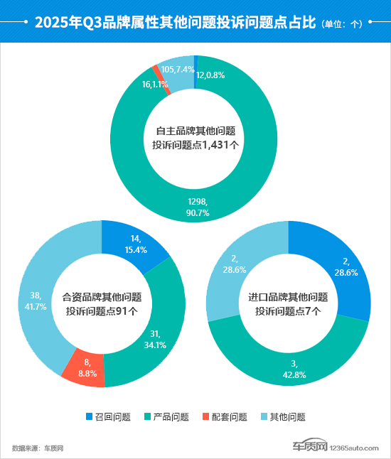 从其他问题投诉问题点占比可以看到,合资品牌其他问题占比有明显提升,已超过了产品问题,环比提高了19.2个百分点。进口品牌的投诉问题点回升,召回问题、产品问题和其他问题形成“三足鼎立”的局面。