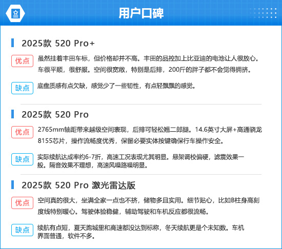 在用户口碑中,多数消费者对2025款广汽丰田铂智3X的乘坐空间、储物空间、智能化等方面表示满意,不过也有部分消费者反映噪音明显,续航缩水等不足。