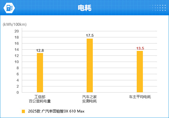 通过收集工信部申报信息、各大汽车垂直媒体测试和车主实测的数据来看,2025款广汽丰田铂智3X 610 Max的工信部百公里耗电量为12.8kWh/100km,汽车之家实测电耗为17.5kWh/100km,车主平均电耗为13.5kWh/100km(数据仅供参考)。
