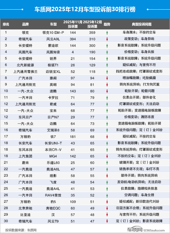 数据显示,本月车质网受理的有效投诉信息共涉及925款车型,其中投诉达两位数(含)以上的车型共248款。此外,车质网本月共接到车企针对投诉的回复20,589条(含部分之前月份投诉的回复)。在去除投诉人因为车企解决得当而自愿申请撤诉的信息后,2025年12月投诉量前30的车系(车型)排名如下:
