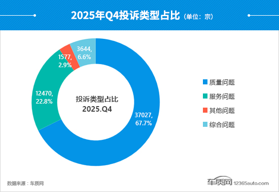 2025年四季度,车质网共受理消费者对汽车产品的有效投诉54,857宗(含第三方平台和后装轮胎投诉共139宗),环比下降1.9%,同比上涨28.9%。据车质网数据统计,本季度共受理202个汽车品牌及1,283个车系的投诉,较上季度减少了24个品牌和52个车系。