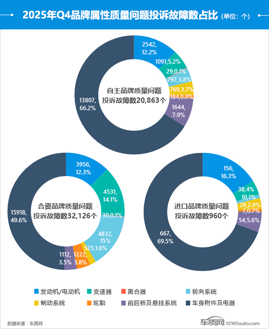 四季度,合资品牌投诉占比年内首次反超自主品牌,较三季度提高3.9个百分点,已超过总量的5成。从投诉类型来看,质量问题仍是投诉核心,投诉故障点集中在“变速箱电脑板故障”、“影音系统故障”和“部件老化”。相比之下,自主品牌本季度的投诉量和占比双双回落,后者降至年内最低点。