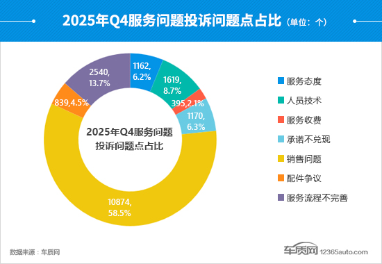 四季度的服务问题中,销售问题占比反弹,较三季度增加了12.1个百分点,在总量中的占比已趋近6成。此外,服务态度、人员技术的投诉故障数有所提升,占比也略有提高。上季度大幅增长的服务流程不完善,本季度占比减少10.7个百分点,回归常态区间。