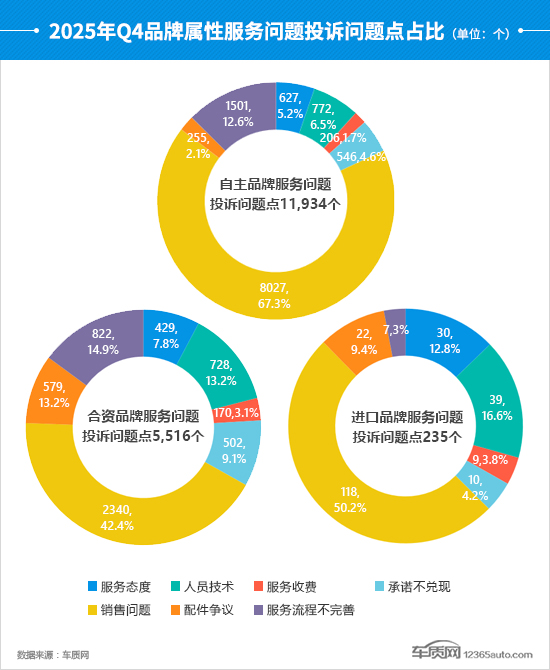 四季度,合资品牌和进口品牌的投诉问题点数量环比均呈增长态势,后者涨幅领先,较三季度上涨38.2%,销售问题是拉动其增长的核心因素。同期,自主品牌不仅投诉问题点数量环比出现下降,占比情况也发生变化。销售问题进一步扩大份额,已超过总量的2/3,环比提高18.3个百分点。