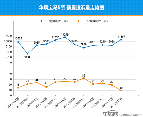 面对新能源车型的冲击,宝马5系的市场走势也不再如往日般稳定,自2025年6月达到顶点后,销量开始陷入低迷,连续5个月跌破万辆大关。12月,叠加政策窗口期与一系列促销活动,宝马5系迎来转机,月销量实现反弹,环比上涨30.4%,为2025年画上一个完美句号。据统计,宝马5系2025年累计销量116,173辆,较2024年上涨30.8%。与销量的波动不同,宝马5系的月投诉走势相对平稳,且自2025年8月开始呈现出走低态势,12月的投诉量降至近一年最低点,口碑表现日趋向好。结合其12月的投诉销量比数值来看,与11月相比明显下降,整体表现值得肯定。依托这一良好态势,口碑效应得到持续释放,宝马5系在2026年有望延续增长动能,冲击月销量新高,顺利斩获年度开门红。