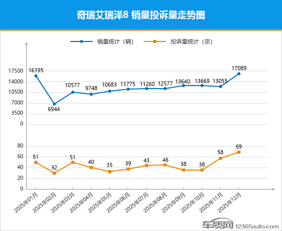 进入2025年,奇瑞艾瑞泽8的市场走势逐步企稳。自5月开始,其销量连续8个月实现破万,12月更是创造了近一年最高纪录。2025年1-12月,艾瑞泽8累计销量147,212辆,同比增长7.1%,在新能源车型热度居高不下的市场背景下,一款燃油车型能做到月均销量过万,且逐年实现正增长,实属不易。反观其月投诉表现,虽然2025年前10个月走势相对平稳,但各月的投诉量都处于高位。而11月和12月的“两连涨”,更是将其月投诉量提升至69宗,达到近一年的最高点。车质网数据显示,艾瑞泽8的投诉多集中在服务问题,“系统升级问题”是投诉焦点。从其12月投诉销量比数值变化来看,较上个月有显著下降,表现有明显进步。短期来看,厚积薄发的艾瑞泽8,后续市场走势有望持续增强,但厂家需正视当前已显现的口碑隐患,只有切实为车主提供周到服务,才能巩固并放大产品力优势,推动市场表现持续向好。