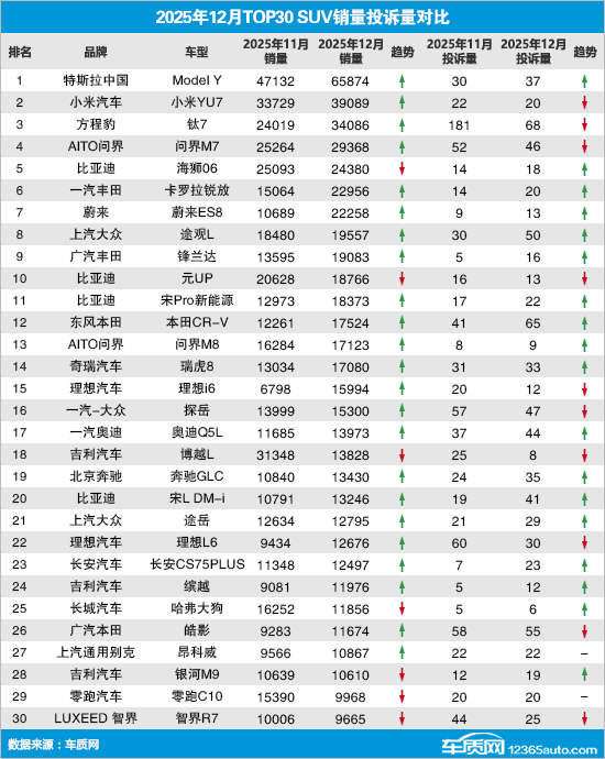 据乘联会提供的全国汽车产销数据显示,2025年12月国内SUV市场累计零售销量117.8万辆,环比上涨4.1%,同比下降12.5%。同期,车质网受理车主针对SUV的有效投诉7,245宗,环比上涨5.7%,同比上涨约7%。去除投诉人自愿申请撤诉的信息后,2025年12月TOP30 SUV销量投诉量排名如下: