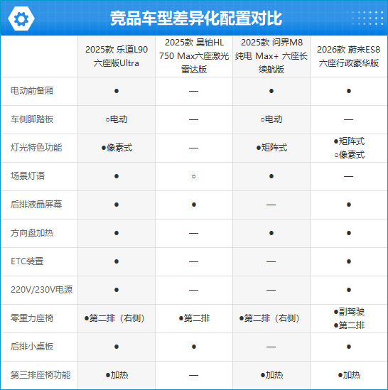 与同级别竞品车型相比,相较昊铂HL、问界M8纯电和蔚来ES8这三款售价更高的大型SUV,2025款乐道L90不仅售价更低,配置层面也达到了同级主流水平。不过由于电池能量较小,因此纯电续航里程不占优势。