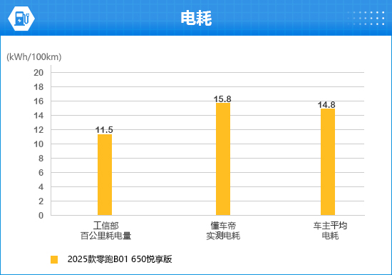 通过收集工信部申报信息、汽车垂直媒体测试和车主实测的数据来看,2025款零跑B01 650悦享版车型的工信部百公里耗电量为11.5kWh/100km,懂车帝实测电耗为15.8kWh/100km,车主平均电耗为14.8kWh/100km(数据仅供参考)。