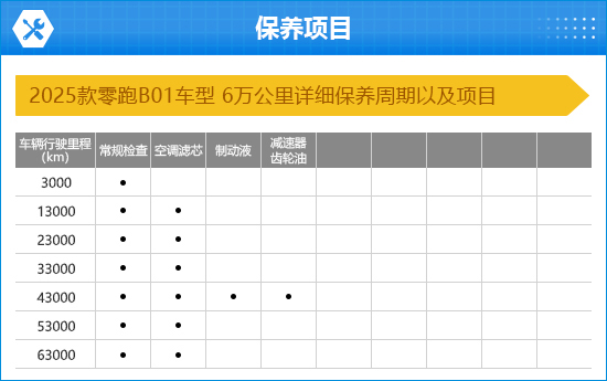 2025款零跑B01整车质保周期为四年或12万公里(以先到为准),终身质保要求首任车主及非营运车辆(责任免除条款以官方为准)。保养方面,首保在3000公里或3个月(以先到为准)时进行,以常规检查为主。后续每1万公里或12个月进行一次常规检查,包含电池、电机、底盘、轮胎和制动系统等关键部件。空调滤芯在13000公里时进行首次更换,后续每10000公里更换一次;制动液和减速器齿轮油均是在首保完成后,每40000公里更换一次。