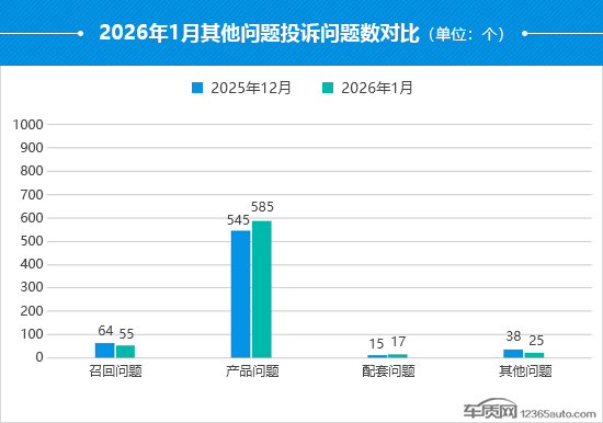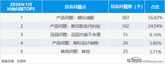在本月其他问题投诉问题点中,产品问题投诉问题数环比小幅反弹,较2025年12月上涨7.3%。从具体问题点来看,“疑似减配”排名升至首位,投诉问题数环比上涨29.4%。