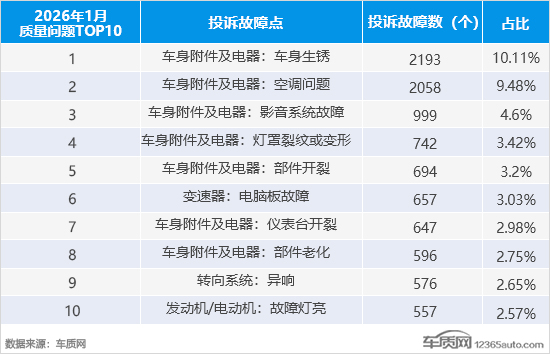 2026年首月,国内汽车投诉依然保持高位运行,多款车型出现短期投诉量激增的情况。从投诉类型来看,质量问题依旧是投诉核心,占比超过7成。其中,车身附件及电器成为本月投诉“重灾区”,尤其是与之相关的“车身生锈”和“空调问题”,短期投诉迎来爆发,主要集中在部分合资品牌车型。值得注意的是,本月服务问题中的“系统升级问题”成为投诉焦点,前些年曾经爆发过的OTA升级后“锁功率”事件再度重演,各大车企须高度警惕。既然都有了前车之鉴,切勿“好了伤疤忘了疼”,深耕产品品质、提升服务水平才是立足根本。