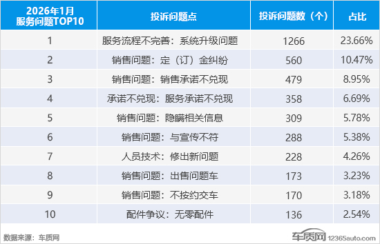 1月的服务问题中,服务流程不完善呈现持续攀升态势,投诉问题数环比上涨32.1%,“系统升级问题”成为投诉焦点,排名已升至TOP10榜单首位。销售问题本月投诉问题数进一步回落,环比大幅降低40.5%,但仍占据着服务问题投诉的核心。TOP10榜单前10名中,与销售问题相关的问题点稳稳占据6席,其中“与宣传不符”投诉问题数环比上涨14.3%,排名略有提升。