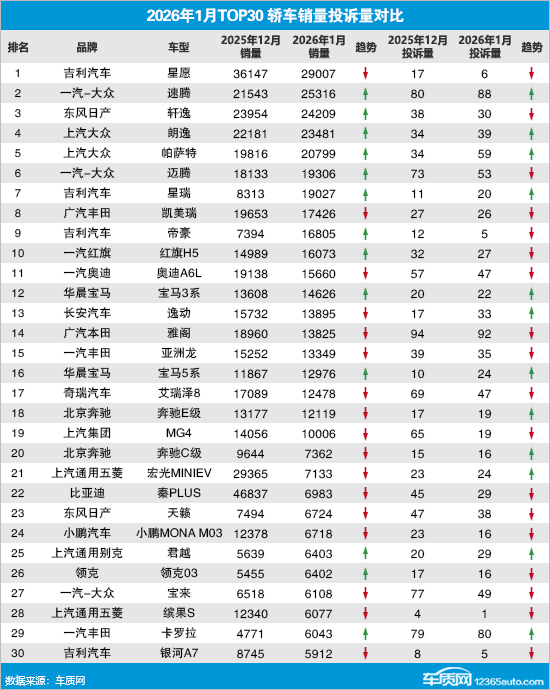 据乘联会提供的全国汽车产销数据显示,2026年1月国内轿车市场累计零售销量62.2万辆,环比下降36.5%,同比下降24.7%。同期,车质网受理车主针对轿车的有效投诉12,286宗,环比上涨4.3%,同比上涨99.3%。去除投诉人自愿申请撤诉的信息后,2026年1月TOP30轿车销量投诉量排名如下: