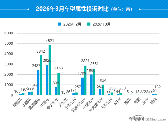本月,中型车投诉量环比上涨65.1%,再度领跑所有车型。值得关注的是,中大型车与大型SUV投诉量环比均实现翻倍增长,其中大型SUV更是达到近5个月以来的投诉峰值。
