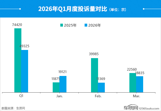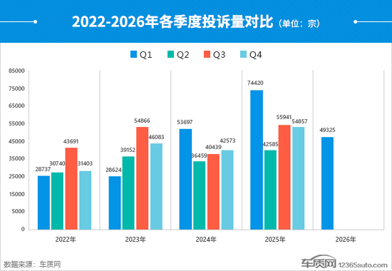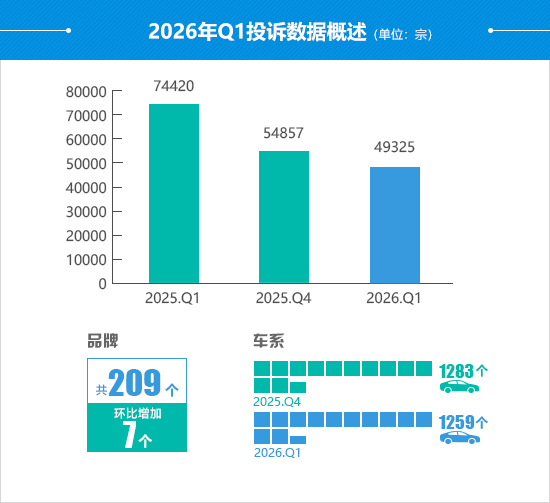 2026年一季度,车质网共受理消费者对汽车产品的有效投诉49,325宗(含第三方平台和后装轮胎投诉共195宗),环比下降10.1%,同比上涨28.9%。据车质网数据统计,本季度共受理209个汽车品牌及1,259个车系的投诉,较2025年四季度增加了7个品牌,减少了24个车系。
