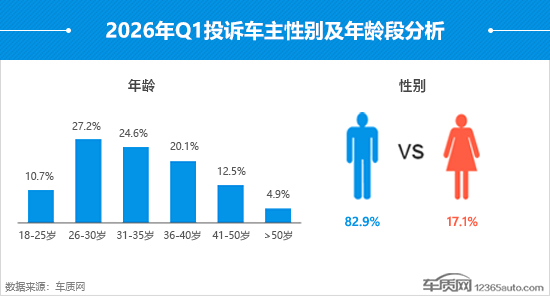从性别占比情况来看,一季度女性消费者的比例持续攀升,较2025年四季度提高了0.9个百分点。在投诉人群年龄段统计中,26-30岁人群占比最高,较上季度提升1.3个百分点。值得注意的是,36-40岁和41-50岁的占比均有小幅提升,中年消费群体的维权意愿在逐步增强。