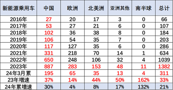 今年1-3月,中国新能源乘用车累计销量195万台,增速达到30%。作为对比,欧洲增速仅4%,北美洲为8%。