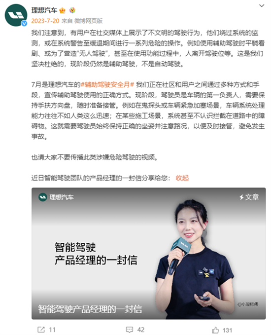 针对此事,理想汽车在官方微博上发文称,注意到部分用户在社交媒体展示不文明驾驶行为,包含使用辅助驾驶时平躺看剧、使用功能过程中离开驾驶位等,“这是我们坚决杜绝的”,且现阶段仍是辅助驾驶,“不是自动驾驶”。