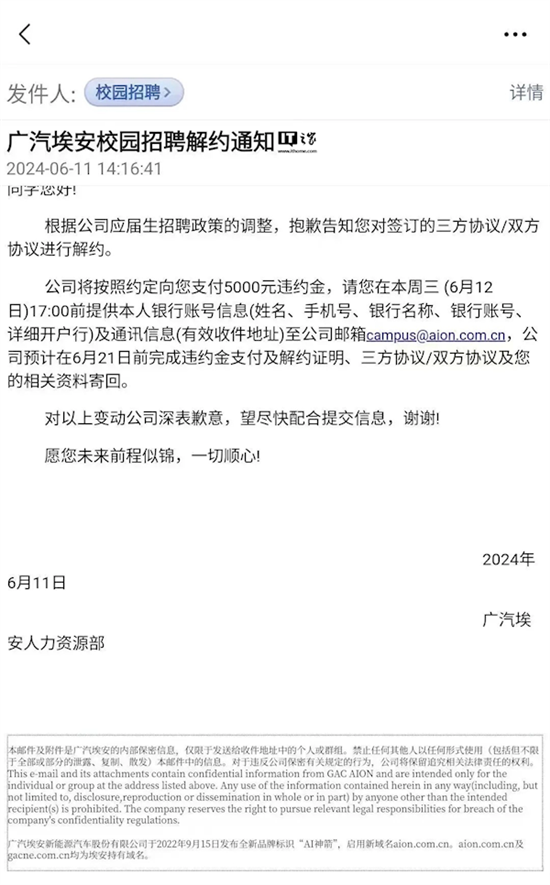 据此前报道,近日,一张以“广汽埃安校园招聘解约通知”的邮件截图在社交平台流传。