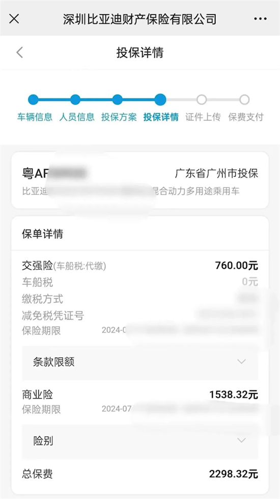 而比亚迪保险只要2298.32元,相比其他保险最便宜的2860元,也打了八折。