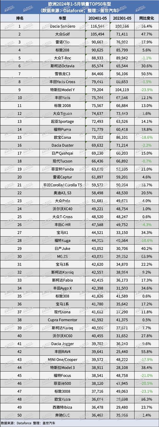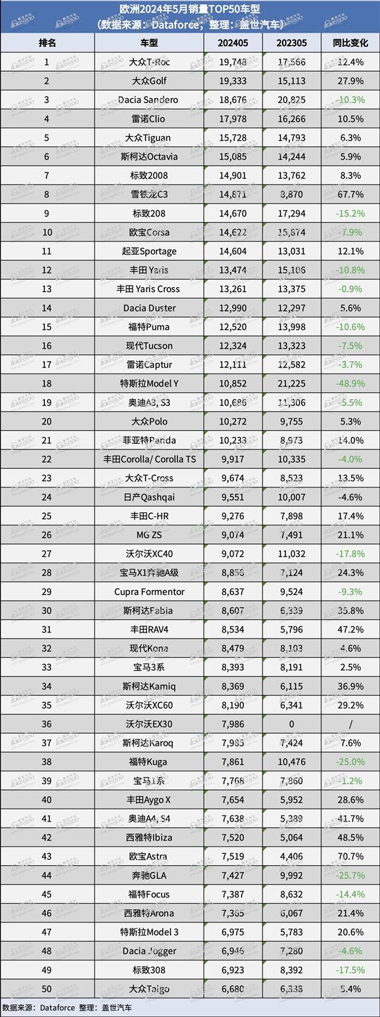 就Dataforce的初步数据来看,大众T-Roc是5月份欧洲最畅销的车型,同比增幅超过12%。大众Golf紧随其后,5月销量同比劲增28%。Dacia Sandero排名第三,销量为18,676辆,比2023年5月下跌10%。