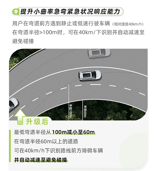 此外,系统还提升了对小曲率急弯的响应能力,将弯道半径的下限从100米减少至60米,使车辆能够在急弯道路上更早识别障碍并自动减速,避免碰撞。