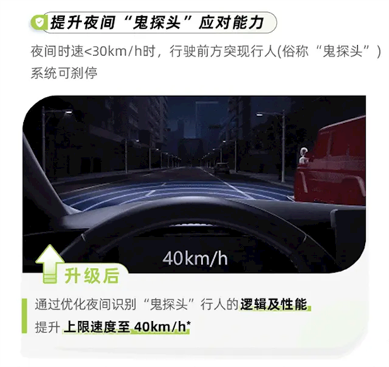 通过优化夜间识别行人的逻辑和性能,将识别上限速度提升至40公里/小时。