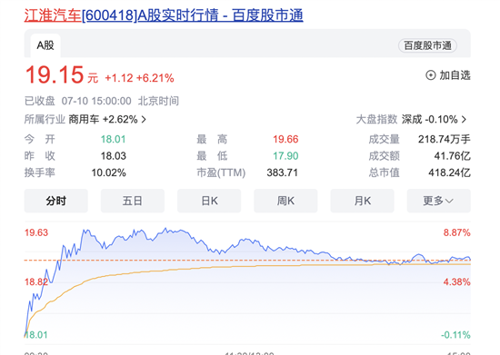 这一利好消息迅速引发市场反响。次日(7月10日)开盘后,江淮汽车股价应声大涨,涨幅一度接近9%,最终以涨超6%收盘。有股民欣慰地表示:"已经建仓很久了,终于看到点动静!"