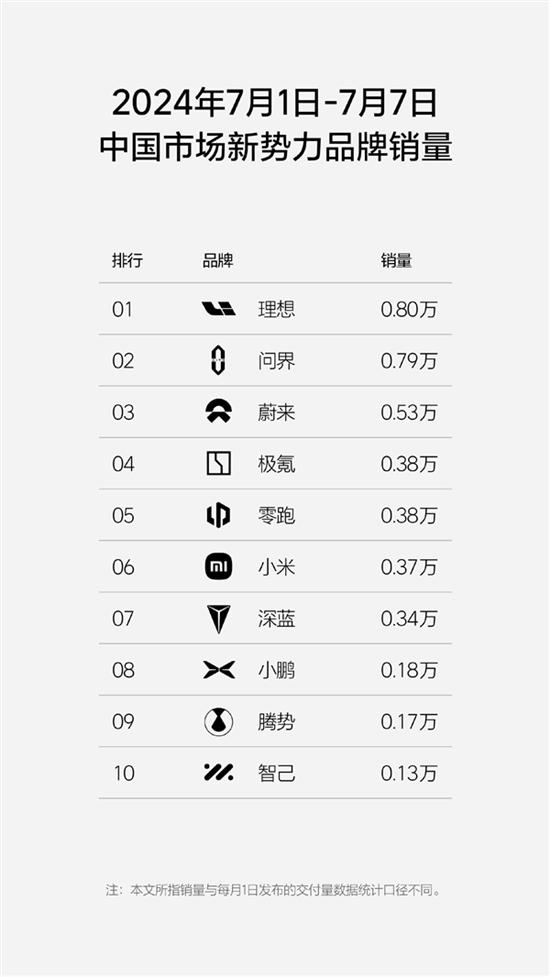 至于第六至第十名,则分别为深蓝(0.33万辆)、小米(0.23万辆)、腾势(0.19万辆)、小鹏(0.17万辆)和智己(0.15万辆)。