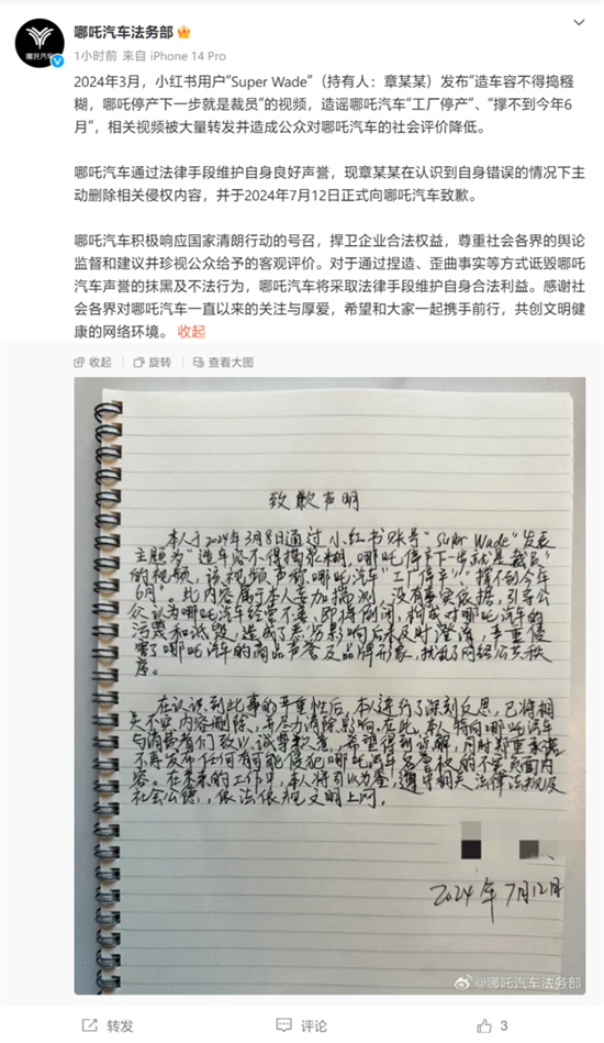 7月26日消息,哪吒汽车法务部今天傍晚发文宣布,此前通过网络平台发布哪吒汽车相关谣言的用户已经正式致歉。