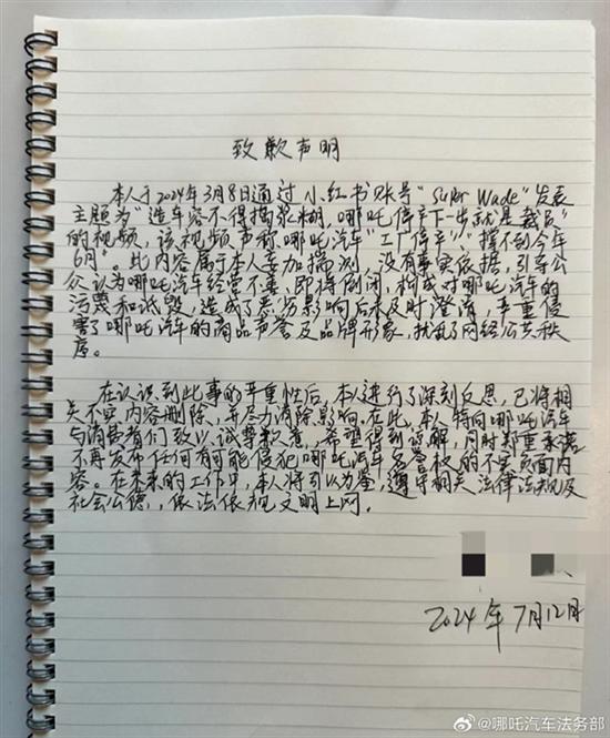 目前,该用户章某某已经意识到了自己的错误,并主动删除了相关侵权内容,并在2024年7月12日正式向哪吒汽车公开致歉。