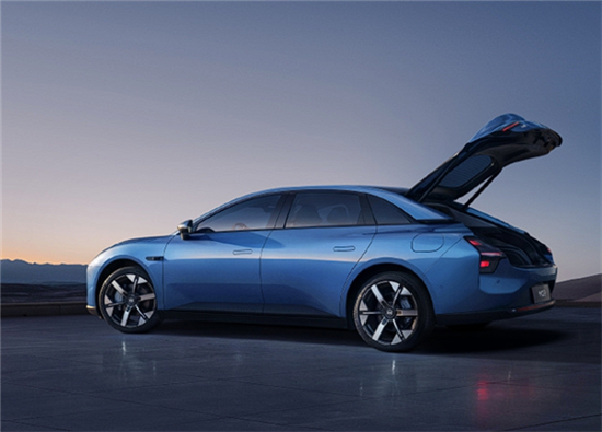 车身侧面呈现标准三厢轿车结构,腰线平直,前后侧翼子板设计营造出宽体视觉效果,配备19英寸轮圈,风阻系数仅为0.194。