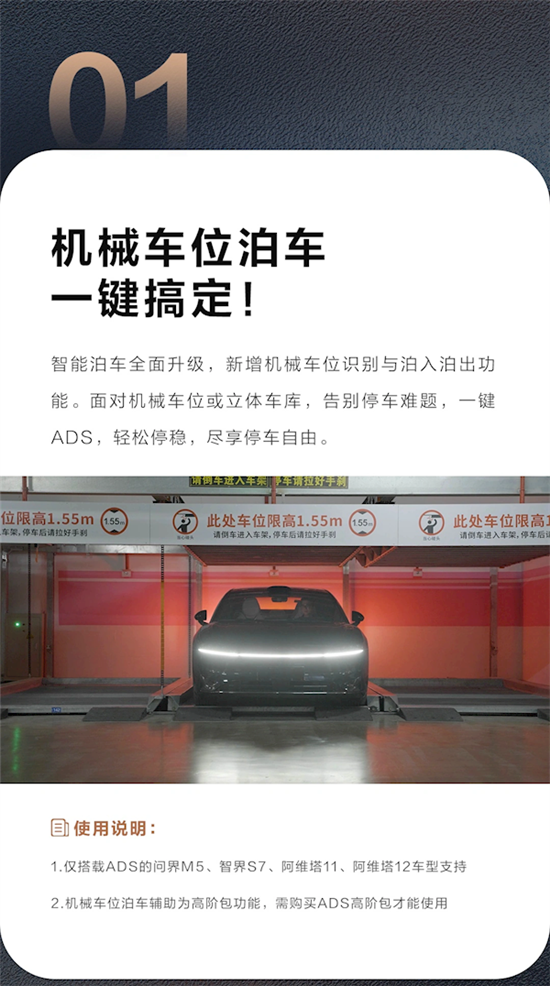 1、智能泊车升级:新增了对机械车位的识别与自动泊入泊出功能,使得在机械车位或立体车库中的停车变得更加简便。(这一功能仅适用于搭载ADS系统的问界M5、智界S7、阿维塔11和阿维塔12车型。)