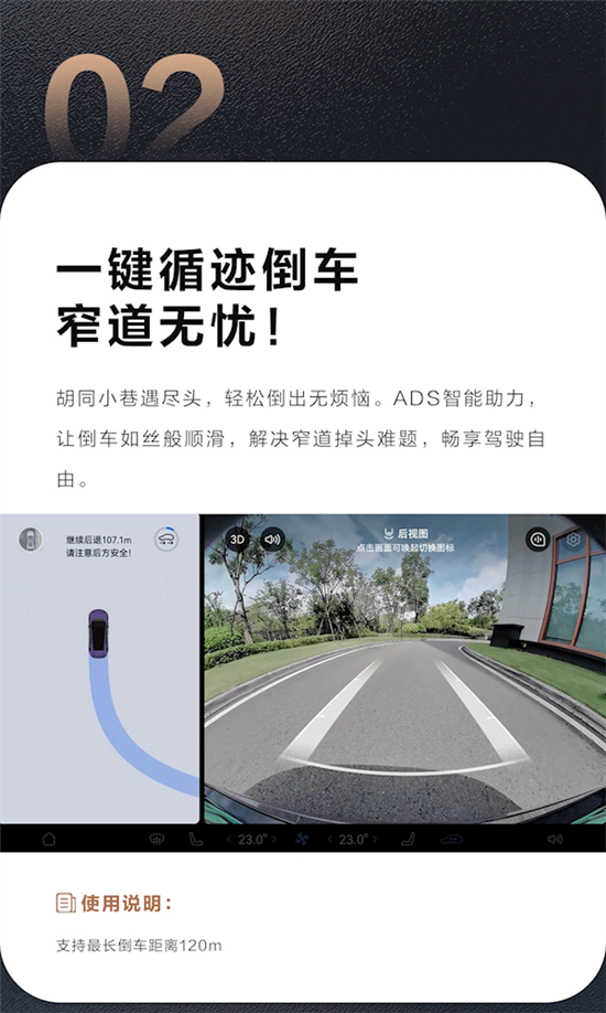 2、一键循迹倒车:在狭窄的胡同小巷等场景中,ADS智能助力倒车功能可以支持最长120米的倒车距离,提高了驾驶的便捷性和安全性。