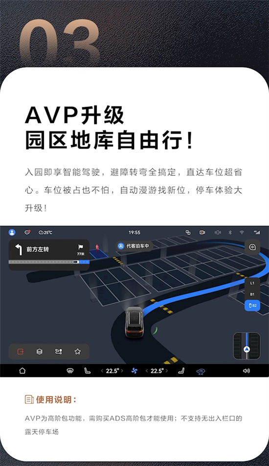 3、AVP升级:增强了自动代客泊车(AVP)功能,支持在地下车库等场景中的智能驾驶,但需购买ADS高阶包才能使用,且不支持无出入栏口的露天停车场。