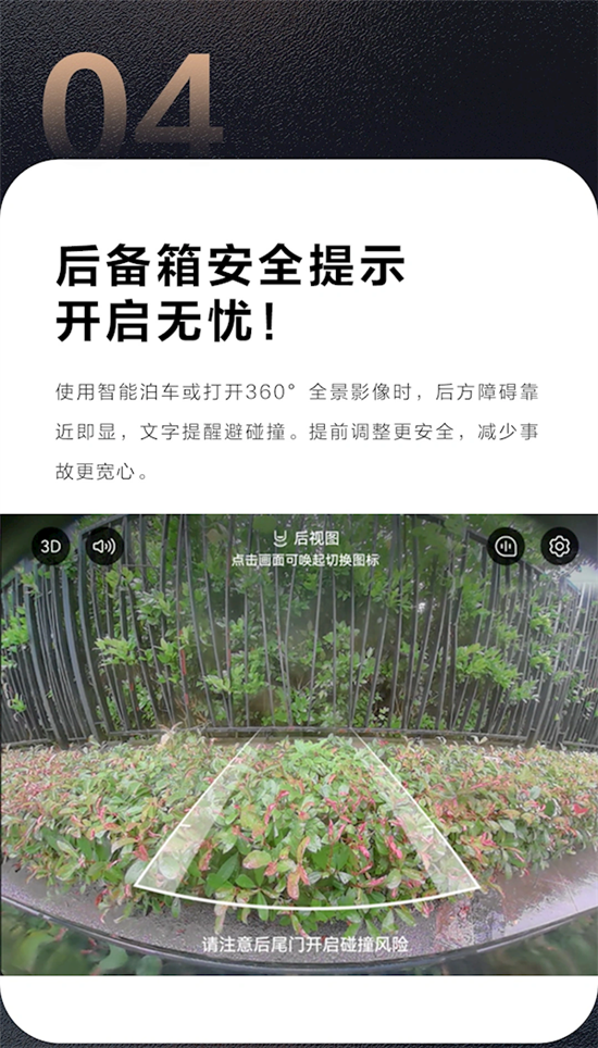 4、后备箱安全提示:在使用智能泊车或打开360°全景影像时,系统会在后方障碍物靠近时提供文字提醒,帮助避免碰撞。