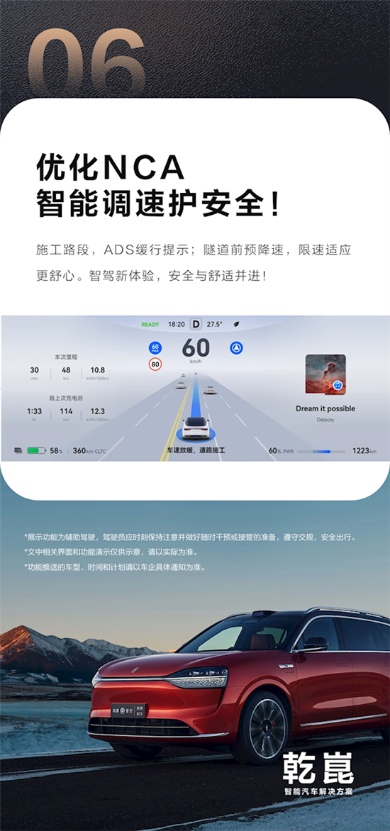 6、优化NCA:针对施工路段,ADS系统将提供缓行提示,隧道前预降速功能,以及更舒心的限速适应,进一步提升驾驶体验。