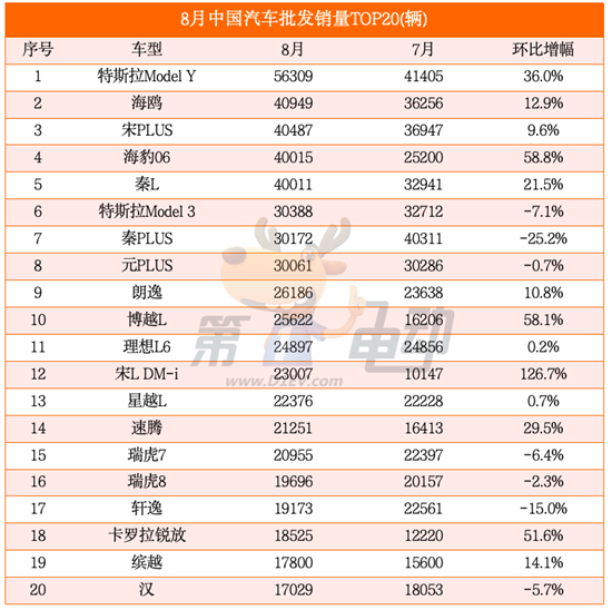 8月,特斯拉Model Y销量达到5.6万辆,环比上涨36%,稳居冠军宝座。海鸥销量再次突破4万辆,环比上涨12.9%,首超秦PLUS跻身第二,而由于秦L和海豹06销量的大涨,曾经的销量冠军秦PLUS,销量环比大降25%,跌落前五至第七。