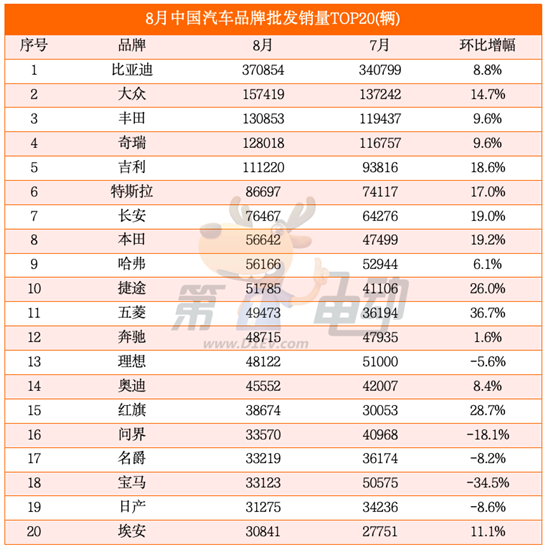 8月,比亚迪销量超37万辆,再创历史新高,遥遥领先无人能敌。这是其3月销量突破3万辆以后,势如破竹连续6个月销量创新高。紧随其后的是大众、丰田、奇瑞和吉利,稳居TOP20前五。