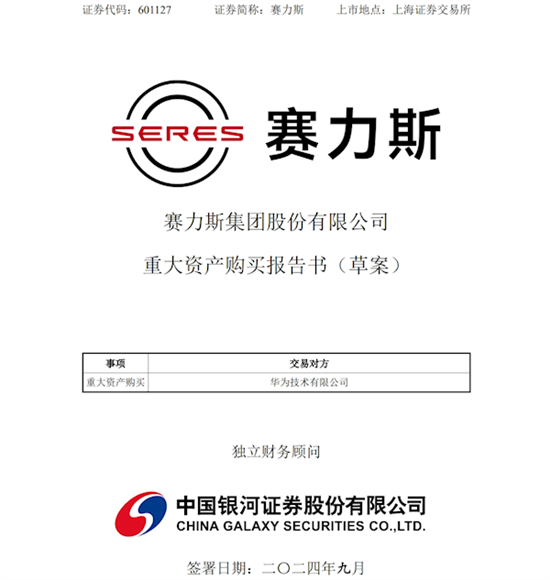 9月20日消息,赛力斯今晚发布了《重大资产购买报告书(草案)》,全资子公司赛力斯汽车拟以支付现金的方式购买华为技术持有的深圳引望智能技术有限公司(深圳引望)10.00%股权。