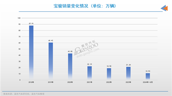 不过,上汽通用五菱借助宝骏品牌完成向上的梦想并未实现。公开数据显示,2018年-2024年前8月宝骏汽车的销量分别为87.91万辆、60.42万辆、42.85万辆、22.19万辆、18.98万辆、21.24万辆和10.93万辆。