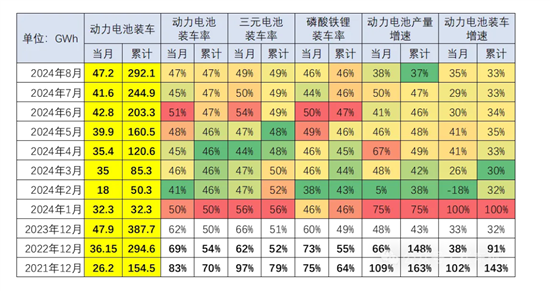 崔东树指出,2021年动力电池装车的生产电池装机率达到70%, 2022年是54%,2023年是50%。2024年1-8月动力电池的产量中装车的比例降到47%,其中三元锂电池装车率为49%,磷酸铁锂电池装车率为46%。