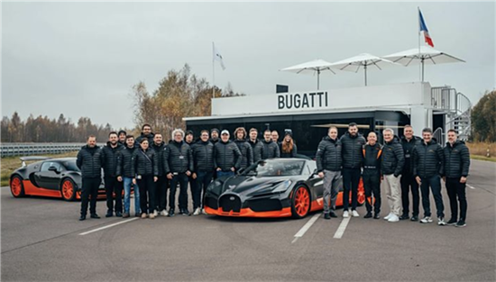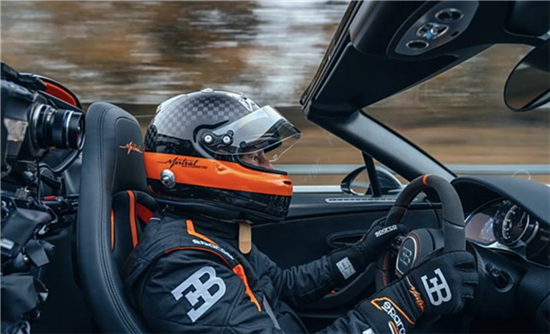 W16 Mistral的车身采用裸露碳纤维组件和橙色涂装,测试车手的头盔与之相呼应,彰显速度与激情。
