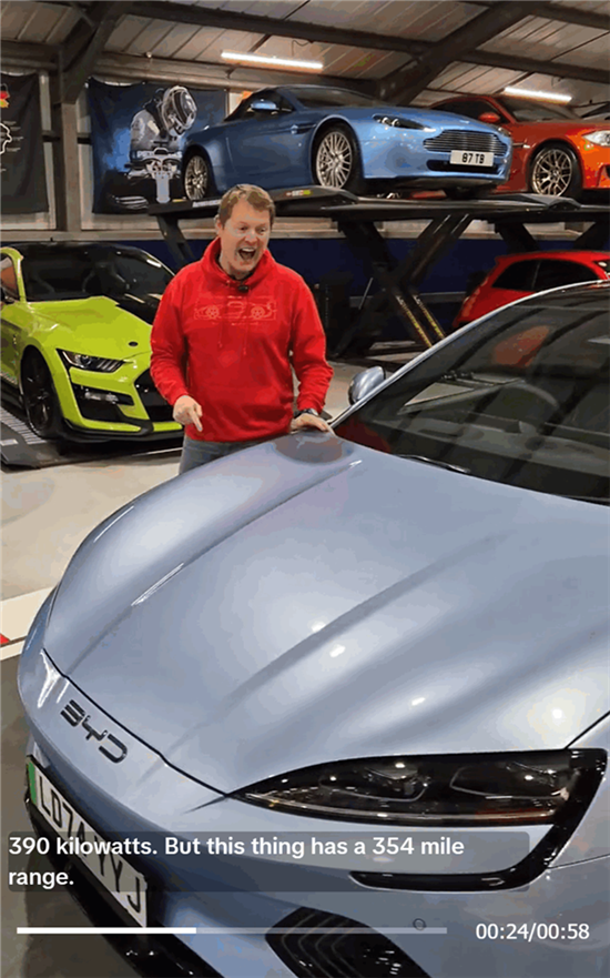 shmee表示,这台蓝色的比亚迪海豹是全轮驱动,拥有523Ps马力,续航354英里,零百加速3.8秒非常快,让他印象深刻。